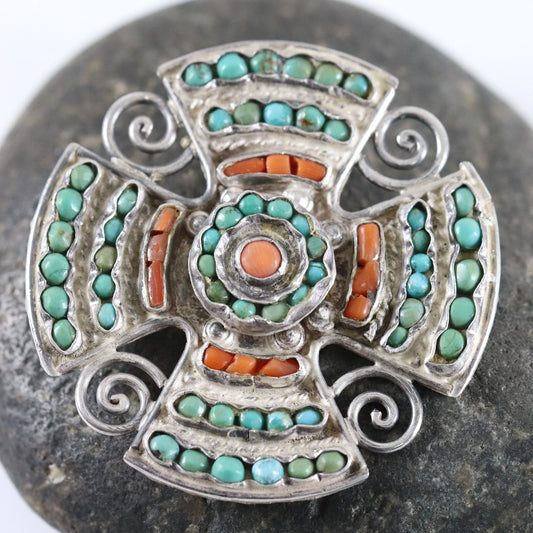 Vintage Matilde Poulat Jewelry | MATL Turquoise and Coral Sterling Silver Brooch Mexico