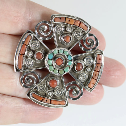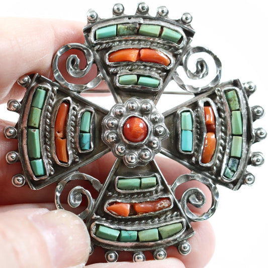 Vintage MATL Jewelry | Ornate Cross Brooch Coral & Turquoise Mexico
