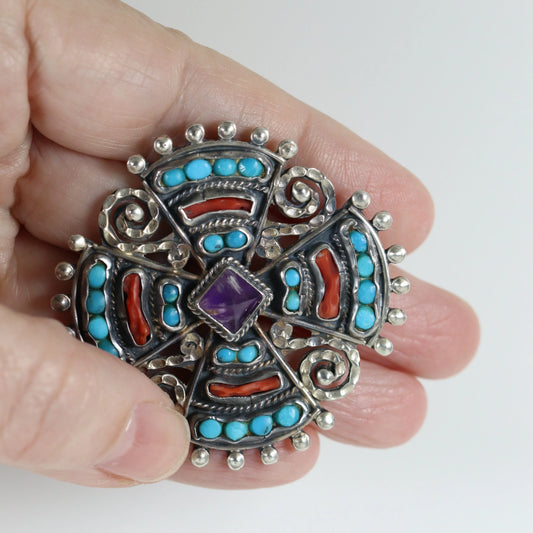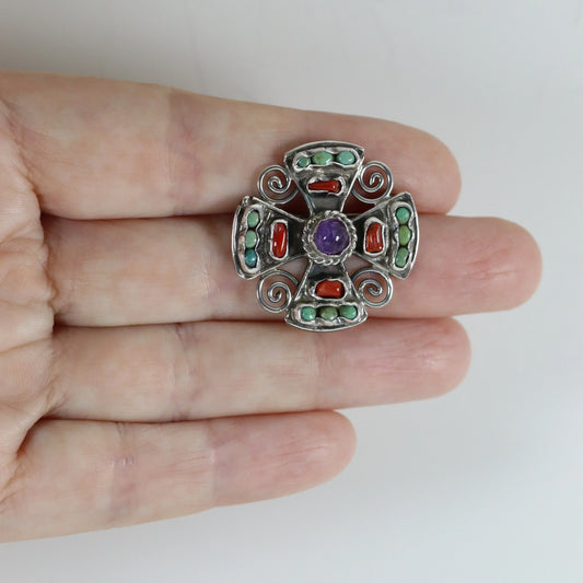 MATL Brooch | Ricardo Salas Multi-Gem Cross Pin | Vintage Sterling Silver Mexico