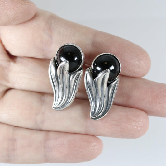Vintage Los Castillo Taxco Silver Mexican Jewelry | Onyx Bell Flower Screwback Earrings