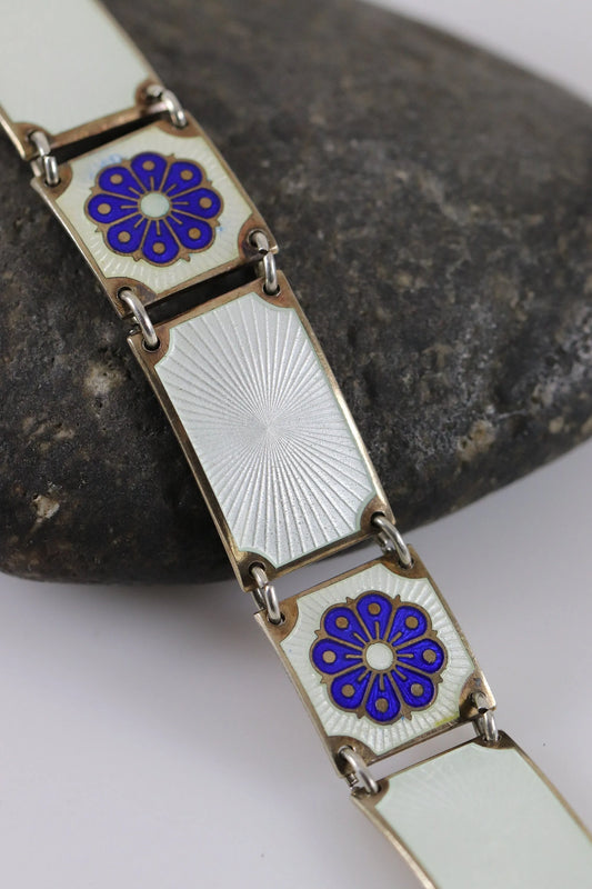 SOLD OUT: David Andersen Enamel Bracelet | Vintage Sterling Silver| Guilloche White and Blue Panel Bracelet Norway