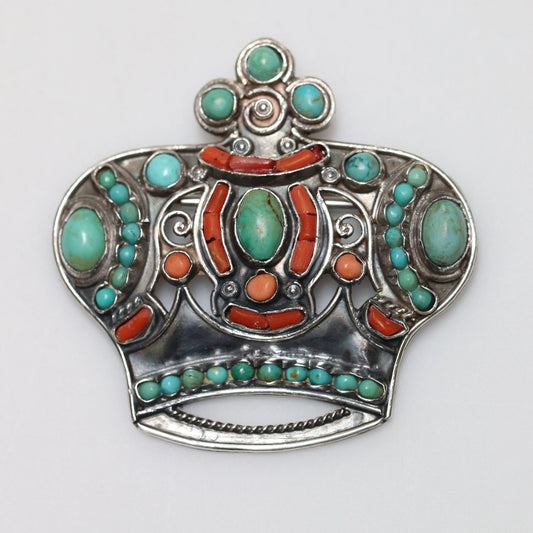 SOLD OUT: MATL Matilde Poulat Crown Brooch | Vintage Sterling Silver | Turquoise and Coral Pin Mid-Century Mexico