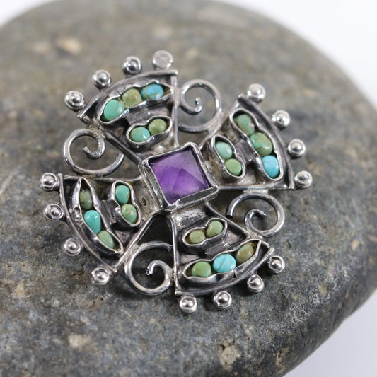 SOLD OUT: MATL Petite Multi-Stone Matilde Poulat Brooch | Vintage Sterling Silver | Amethyst and Turquoise Pin Mid Century Mexico