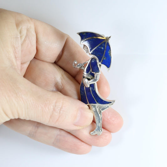SOLD OUT: Vintage Handcrafted Silver Jewelry | Art Deco Girl and Umbrella Lapis Lazuli Brooch