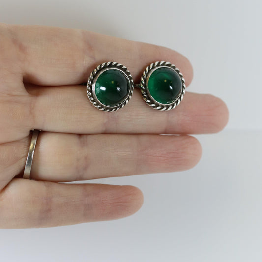 Vintage Los Castillo Taxco Silver Mexican Jewelry | Mid-Century Green Glass Earrings