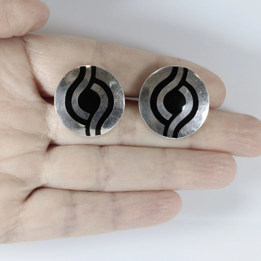 Vintage Margot de Taxco Mexican Jewelry | Round Modernist Black Enamel Cufflinks