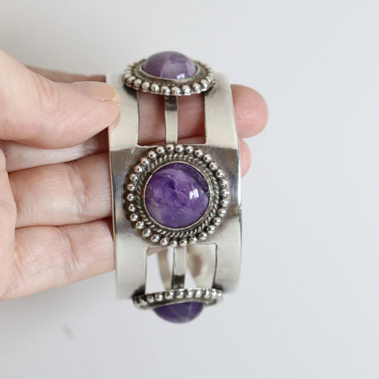 Vintage Taxco Artisan Jewelry | Modernist 980 Sterling Silver Amethyst Statement Bracelet