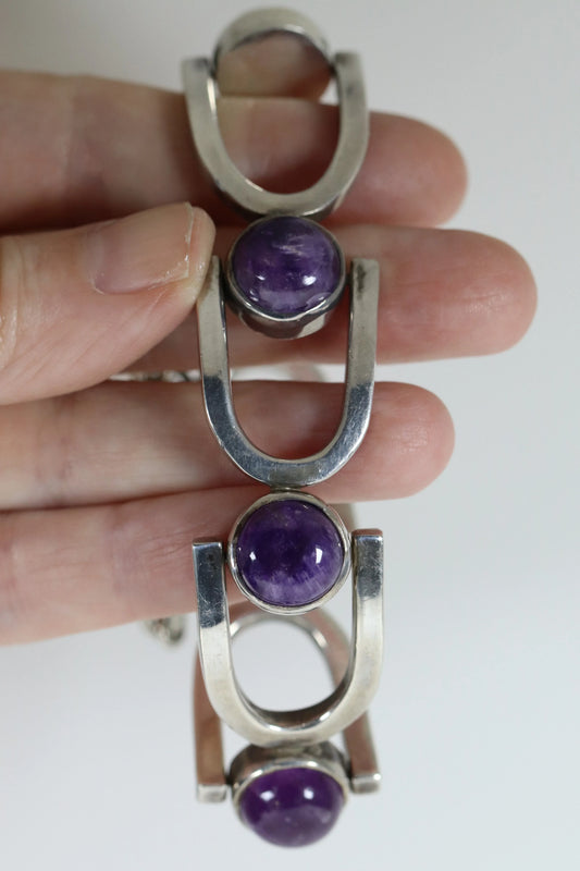 Antonio Pineda Bracelet | Taxco Mid-Century Modernist Horseshoe-Link Amethyst | Vintage 970 Sterling Silver Mexico