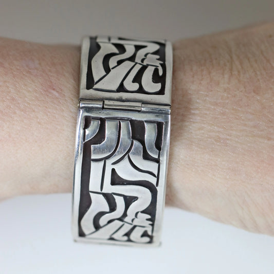 Vintage Silver Mexican Jewelry | Tribal Hinged Handcrafted Bracelet with Safety