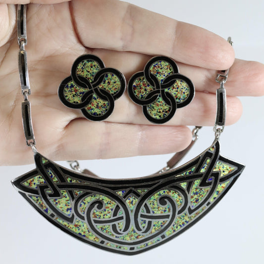 Vintage Margot de Taxco Silber mexikanischer Schmuck | Taxco Schmuckset aus Halskette/Brosche und Ohrringen aus Sterlingsilber und Emaille