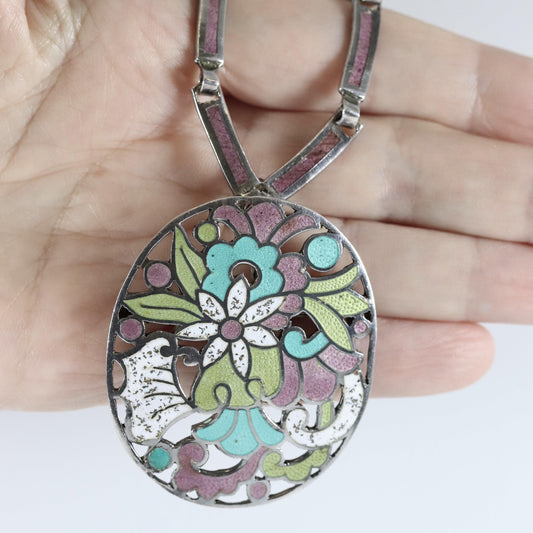 Vintage Margot de Taxco Silber mexikanischer Schmuck | Mauvefarbene Mid-Century-Emaille-Anhänger-/Broschen-Halskette