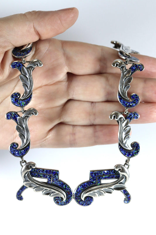 Vintage Margot de Taxco Silber mexikanischer Schmuck | Blaue Konfetti-Emaille-Halskette aus der Mitte des Jahrhunderts