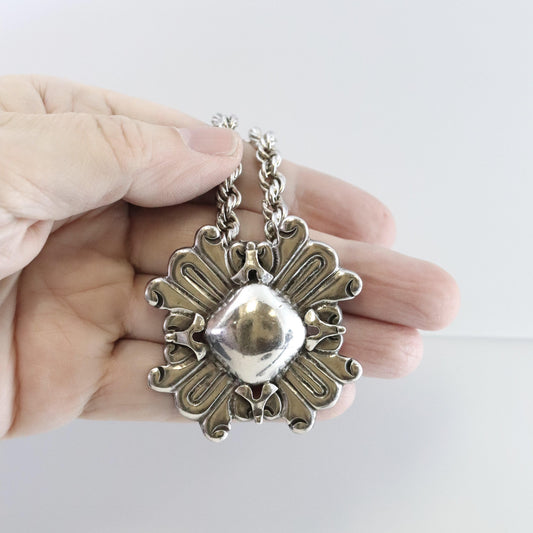 Vintage William Spratling Taxco Silber Mexikanischer Schmuck | Schwerer handgefertigter Sonnenanhänger mit Seilkette