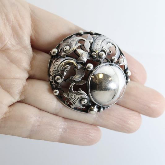 Vintage NE aus Sterling Silber Schmuck | Runde Silber-Cabochon-Fischbrosche