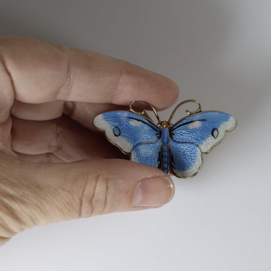Vintage Hroar Prydz Emaille Schmuck | Blaue und weiße Guilloche-Emaille-Schmetterlingsbrosche