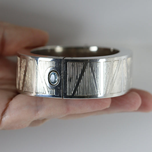 SOLD OUT: Vintage Modernist Silver Jewelry | Aquamarine Etched Modernist Hinged Bracelet