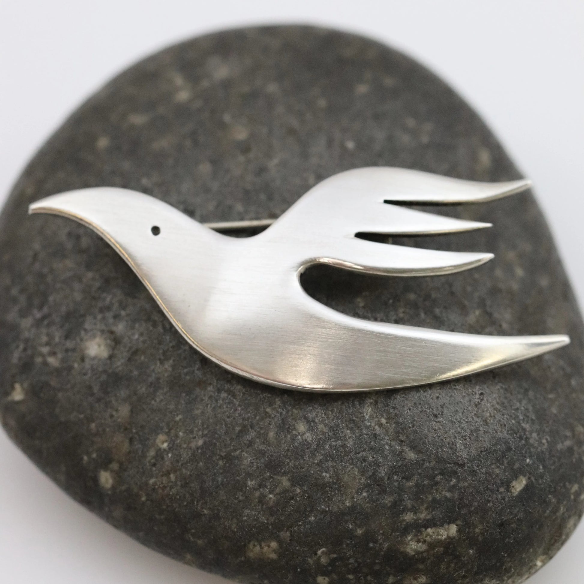 A striking modernist brooch by E. Dragsted, who's early heritage included being the jeweler for the Danish Royal Family. This sculptural peace dove captures the essence of mid-century Scandinavian design—minimalist, elegant, and purposeful. The bird is rendered in dynamic flight, its streamlined form conveying both movement and serenity through clean lines and refined proportions. Crafted in sterling silver with a soft brushed finish that enhances its understated sophistication, the brooch bears full hallmarks attesting to its authenticity and craftsmanship. A timeless symbol of peace and an exemplary piece of Danish design heritage, it works beautifully as a statement accessory or a meaningful addition to a curated jewelry collection.