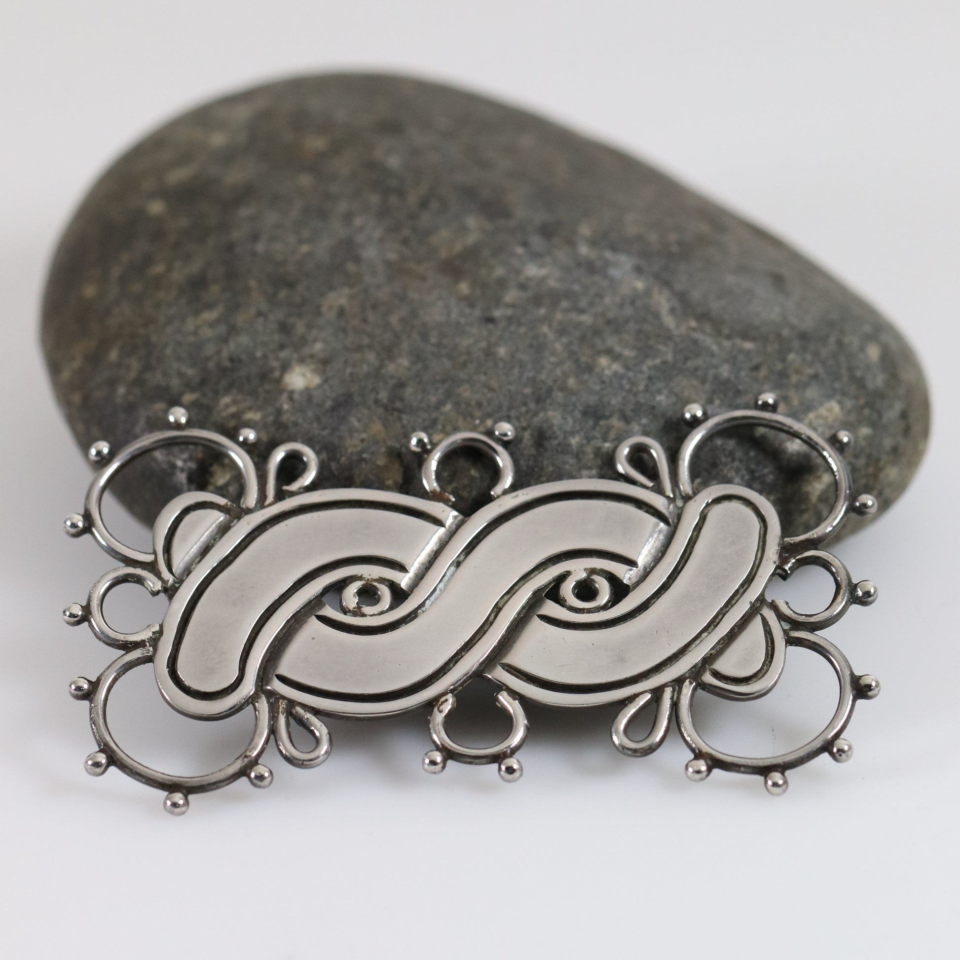 Immerse in the timeless elegance of Danish design with this impeccable Georg Jensen sterling silver brooch. Crafted post-1944 in Denmark, its exquisite interlocking loops and elegant curves showcase Jensen's signature blend of modernist aesthetics and impeccable craftsmanship. The piece's sleek, reflective surface highlights the intricate detailing, adding a touch of sophistication to any ensemble. Celebrate the legacy of one of the most revered silversmiths in history with this iconic piece, perfect for collectors and aficionados of fine jewelry.