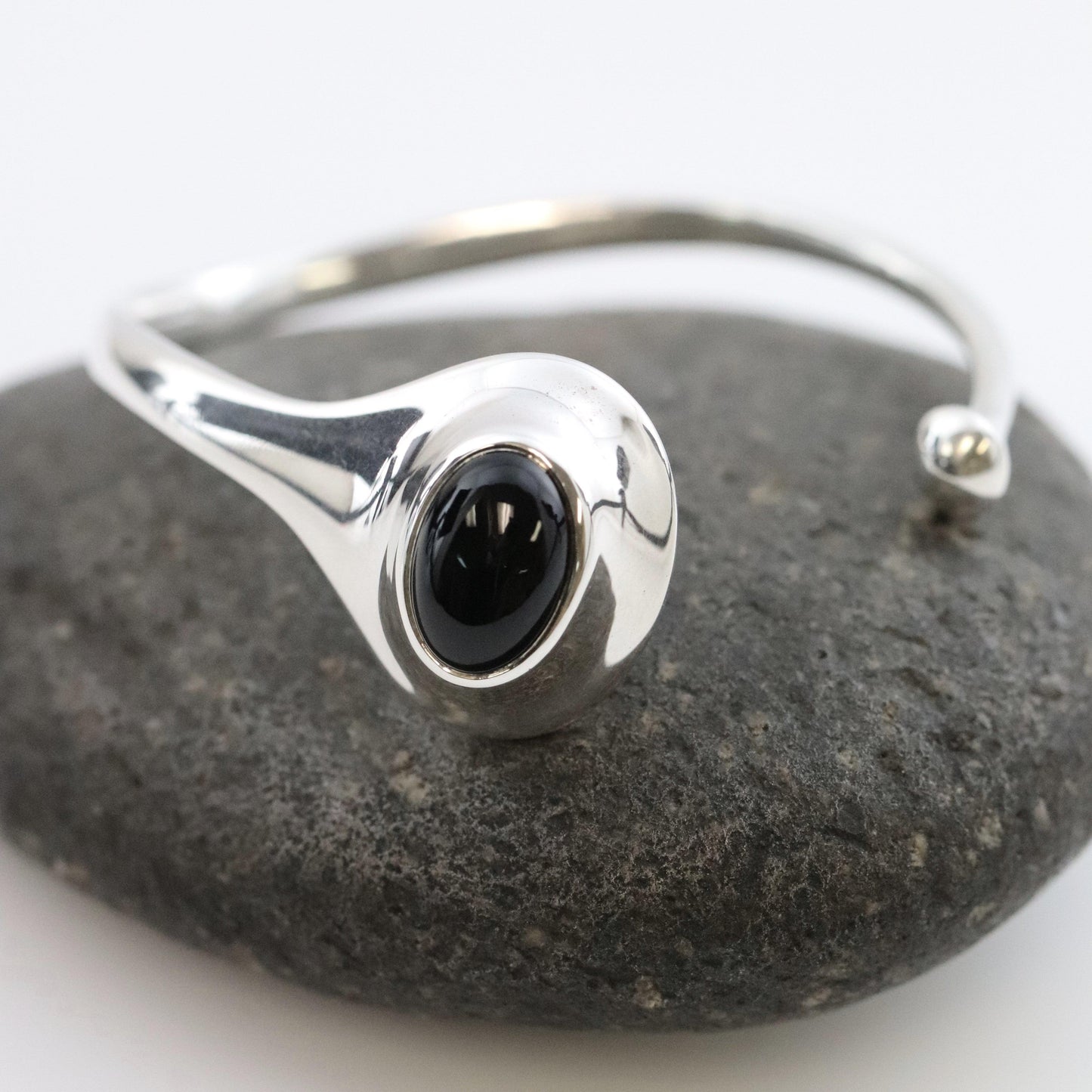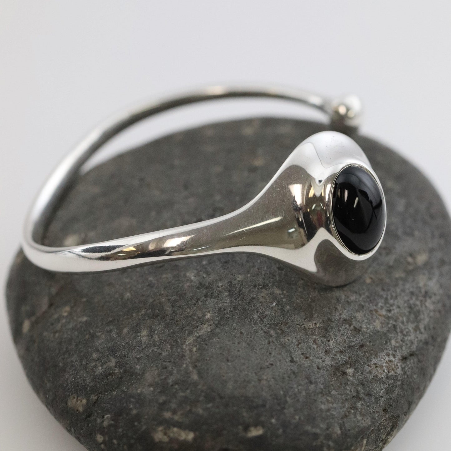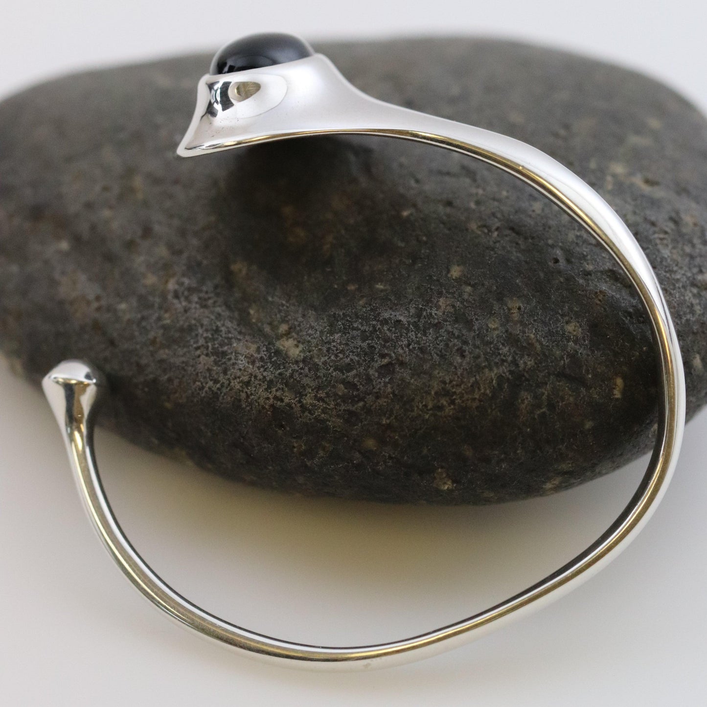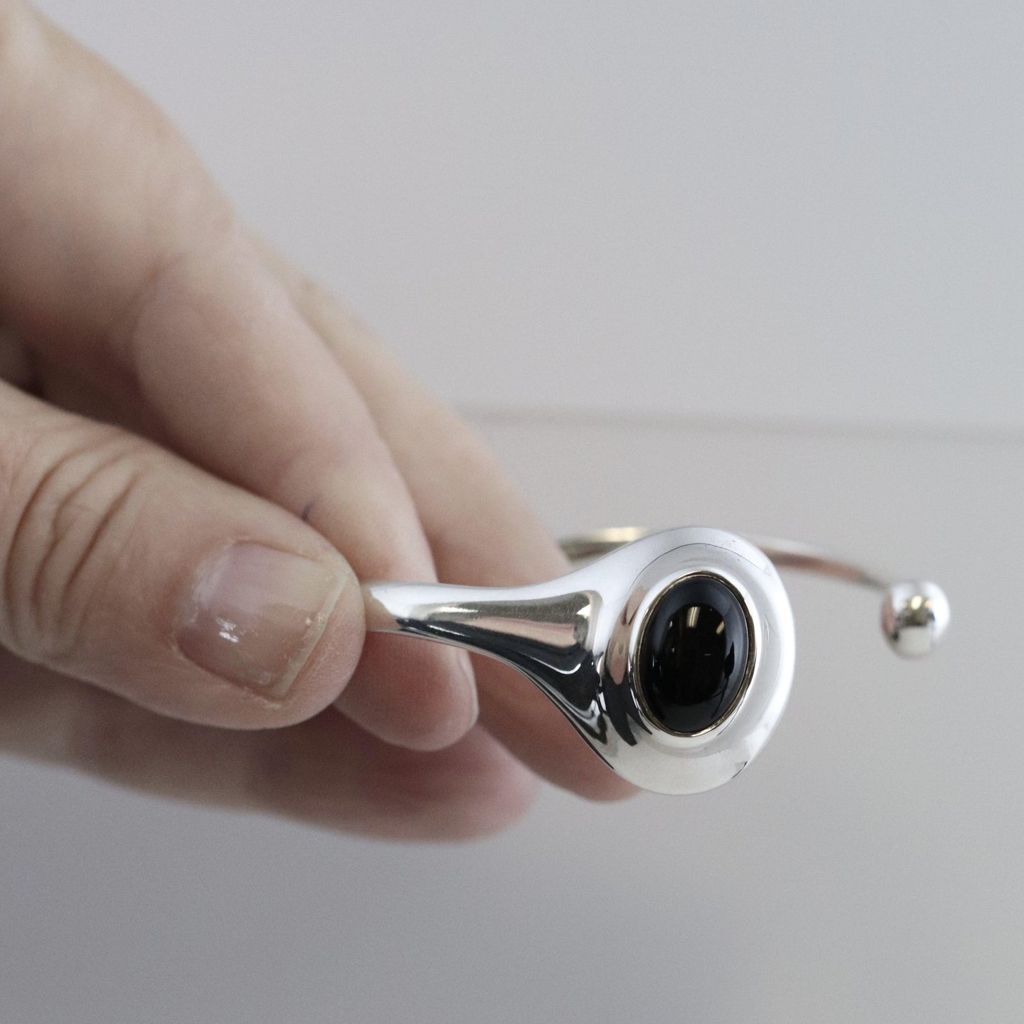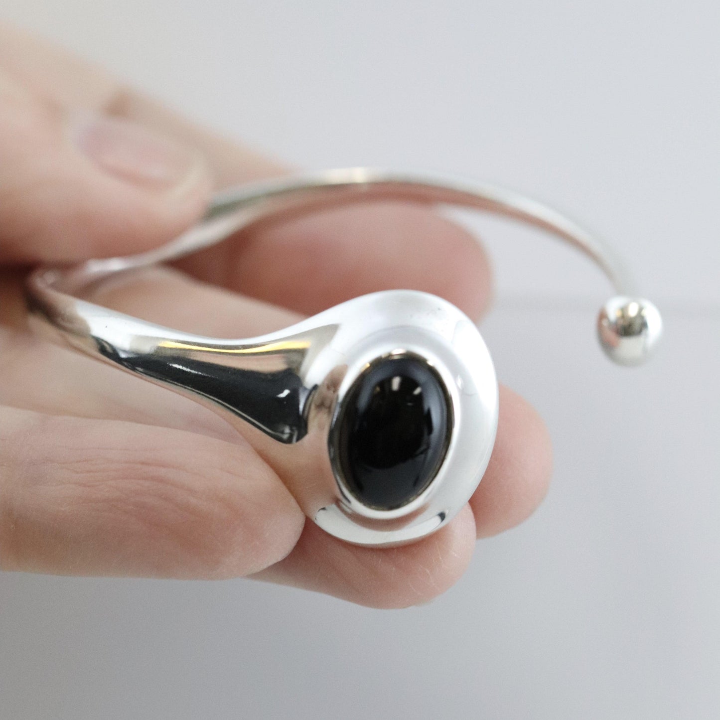 Part of the Vintage Georg Jensen Jewelry Collection, this Bracelet 269 is a testament to the innovative spirit of Vivianna Torun Bülow-Hübe. It showcases avant-garde elegance with its sleek and contemporary design, seamlessly blending modernity with timeless appeal. The bracelet is distinguished by an elegant oval onyx cabochon at the upper termination, lending an air of sophistication. As a creation of Torun, known for her minimalist and revolutionary approach, this piece is more than just jewelry; it's an investment piece due to her significant impact on the landscape of modern jewelry design.